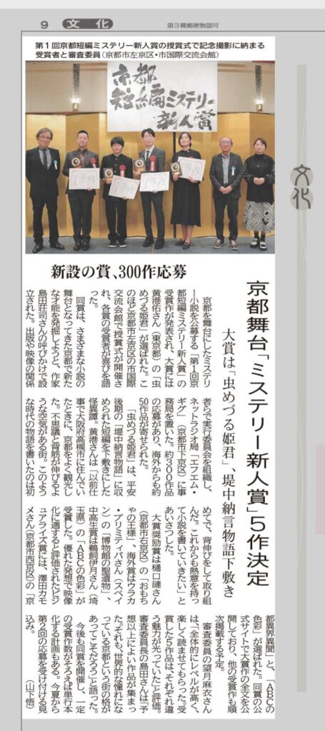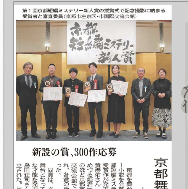 4月14日付の京都新聞朝刊にて、「京都短編ミステリー新人賞」第1回授賞式の様子が掲載されました。